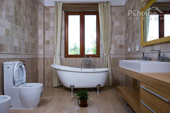 卫生间整体采用了仿古瓷砖的铺贴,让整个卫浴空间显得古朴自然。