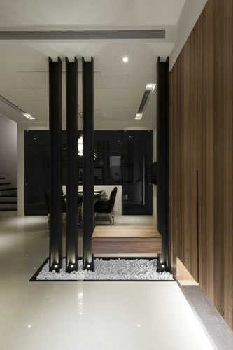 玄关与电视主墙面关系,权释设计以ㄇ字型不锈钢收边,做出一致性的低调表现。