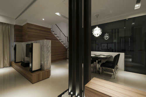造型吊灯将设计现代感发挥的淋漓尽致。钢刷木皮从玄关处,经由电视柜,最后延伸到楼梯间。将现代简约的空间调性,增添了木质的温暖触感。