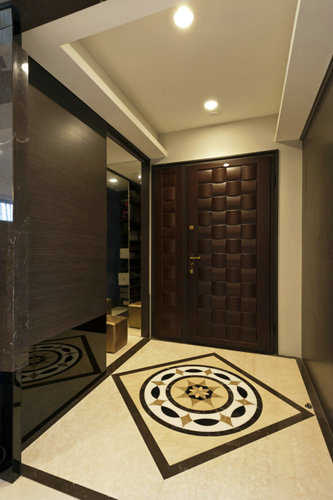 2.玄关衣帽间局部镜材的拼接处理,同一语汇转折出客厅电视主墙,六十度的斜角在橄榄啡大理石华的丽中缓缓倾升,上下跳以墨镜巨献设计感电视主墙面。
