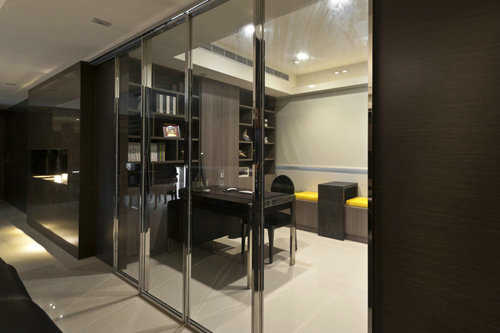 镜面与不锈钢型塑的书房场域,加以卧榻展现多功能休憩和阅读可能。