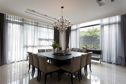 在主卧室为了能合乎屋主年纪身分地位,运用喷漆线条营造出高雅大方的气氛。主墙和书房之间保留局部穿透的空间,搭配一盏设计师款的鱼鳞片吊灯,近看能发现仿似玫瑰花瓣的线条,提升细节的精致度。