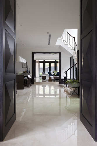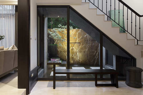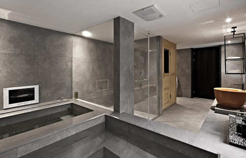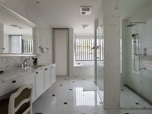运用石材立柱,兼具穿透及层次感。而加长的洗手台面,也规划出让女主人坐在小椅子,轻松地吹头发或卸妆的空间。