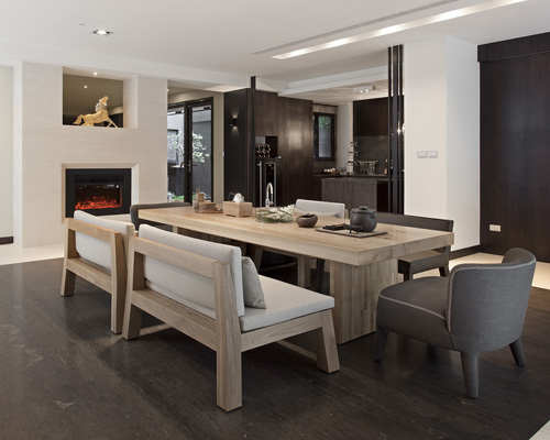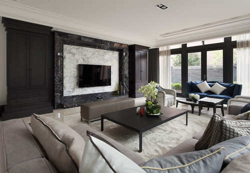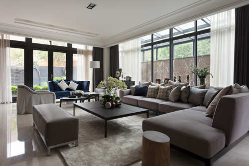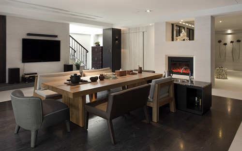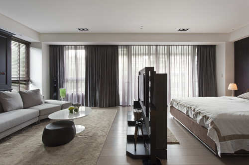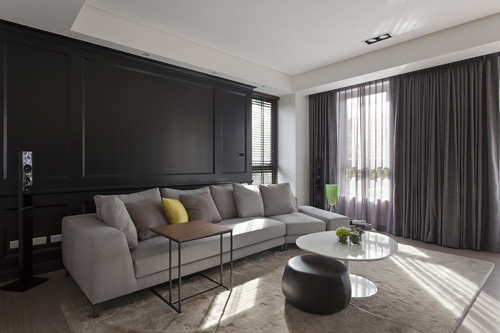 房内搭配海湾型沙发,微微的弯曲度,却能带来温暖包覆的感受。简洁的电视墙,预留给居住者摆放收藏的空间。