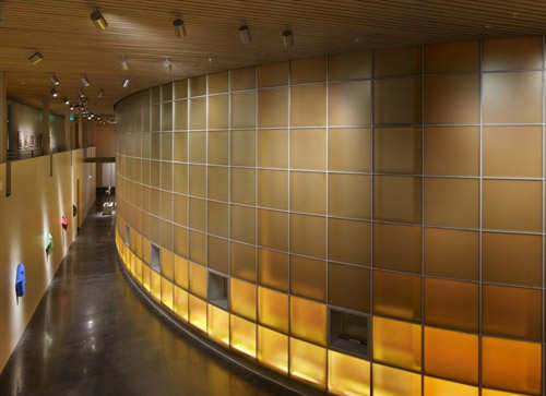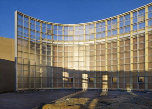 * 采光玻璃墙,如同附近的海滩黄色发光玛瑙,光线柔和像云彩一样,带来神秘的雾一样的感觉。夜间如同灯塔一样发光。