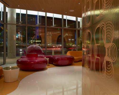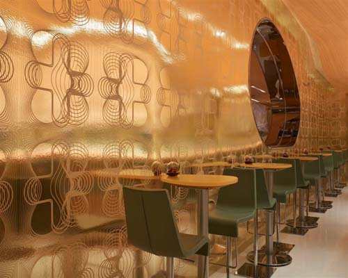 白天的时候,在自然光的照射下,酒吧呈现出生动丰富的色彩。到了晚上,微妙的背景灯光又营造出一种愉快、温馨的气氛。“丝绸之路”酒吧会让客人自己体验到一种自由交际的快活感,从早餐到晚餐都能欣赏到酒吧里面的迷人灯光。在三个不同主题的区域,设计了一扇弯曲的墙壁,这样就能创造出一种从早到晚呈现出来的不同动态效应。