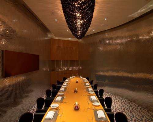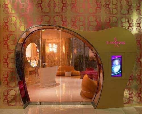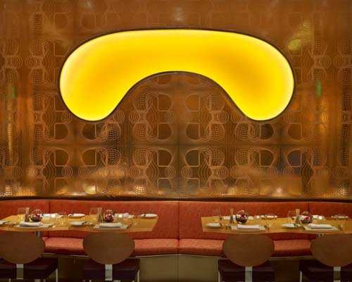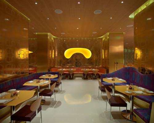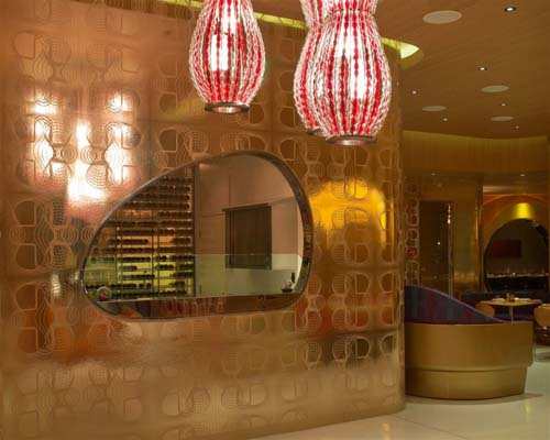 酒吧里外形成一种强烈的对比:即带有粉红色窗户的金色镜子和用餐区不规则的图案。由设计师Karim设计的玻璃纤维家具恰好反射出玻璃地板的金色。另一边是一个颇具创意的小酒吧,凝聚了“丝绸之路”餐厅本身的特色。