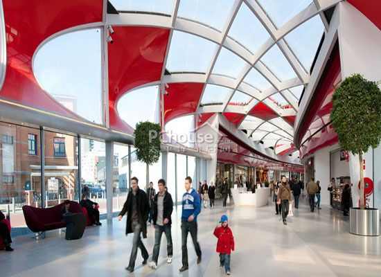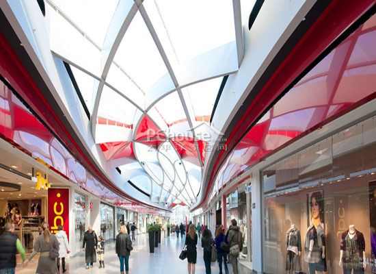 购物中心长350米,一头穿过翻新的旧市场中心,另一头则直达一座两层高的新建筑,与比利时国际电视中心相连接。屋顶设计加入了复杂的网状元素,外观均为钢铁材质。无论在高度上还是厚度上,这种曲折迂回的结构都呈现出与众不同的变幻画面。