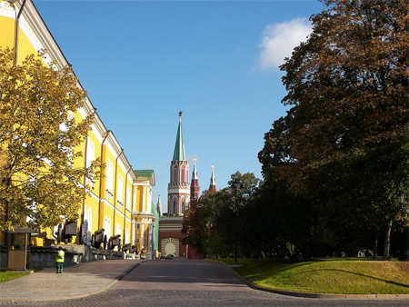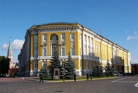 大克里姆林宫是克里姆林宫中的主要建筑之一。克里姆林宫墙内,朝向莫斯科河有三列高窗的漂亮建筑物就是大克里姆林宫,1839~1849年在旧宫原址上建造,由古老的安德烈夫斯基大厅和阿列克山德洛夫斯基大厅联结而成。大克里姆林宫外观为仿古典俄罗斯式,厅室全部建筑式样多样,配合协调,装潢华丽。宫殿的正中是饰有各种花纹图案的阁楼,上有高出主建筑物的紫铜圆顶,达13 米,并立有旗杆,节假日则升国旗。大克里姆林宫内部呈长方形,楼上有露台环绕的总面积达2 万平方米的700 个厅室。从前,第一层除了处理政务的处所以外,全是沙皇私人宫室,白色宽阔的楼梯通往二层各厅,这里有格奥尔基耶夫大厅、弗拉基米尔大厅和叶卡捷琳娜大厅,从前还有安德烈耶夫大厅,曾是沙皇接见使臣的地方。