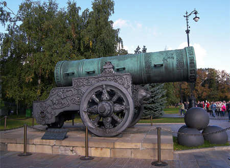 这门大炮造于1586 年,重40 吨,炮口的直径达0.92 米,可容下三人同时爬进。炮前陈列有四个堆在一起的炮弹,每个重为两吨。炮架上也有精美的浮雕,其中有沙皇费多尔像。