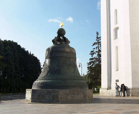 钟王高5.87 米,直径5.9 米,重约200 吨,于1735 年11 月20 日铸成,号称世界第一大钟。钟壁上铸有精美的塑像和图饰,如沙皇阿列克谢与皇后安娜的像,还有五幅神像。但它铸成后敲第一下时就出现了裂痕。《美国百科全书》称它为“世界上从未敲响的钟”。