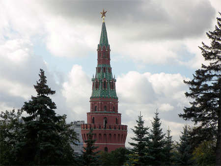 克里姆林宫整体呈不等边三角形。面积27.5万平方米,周长2公里多。 始建于1156年,原为苏兹达里大公爵尤里· 多尔哥鲁基的庄园,有木造小城堡,称“捷吉涅茨”。1367年在城堡原址上修建白石墙,随后又在城墙周围建造塔楼。几经修缮扩建,20 座塔楼参差错落地分布在三角形宫墙的三边。1935年在斯巴斯克塔、尼古拉塔、特罗伊茨克 塔、鲍罗维茨塔和沃多夫塔等塔楼各装有大小不一的五角星,以红水晶石和金属框镶制而成,内置5000瓦功率照明灯,红光闪闪,昼夜遥遥可见。