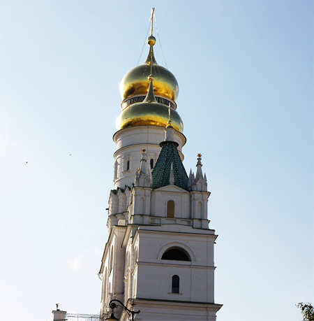 人们从远处遥望克里姆林宫,不难发现有一座建筑高高地矗立在建筑群体中,有鹤立鸡群之感。这个高大建筑就是教堂广场上的伊凡大帝钟楼。它高81米,是古时的信号台和望台。钟楼的左侧有重达40 吨的炮王,右侧是著名的钟王。这两个庞然大物虽然从未使用过,但却显示出了俄罗斯工匠高超的铸造技术。