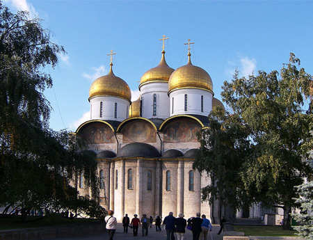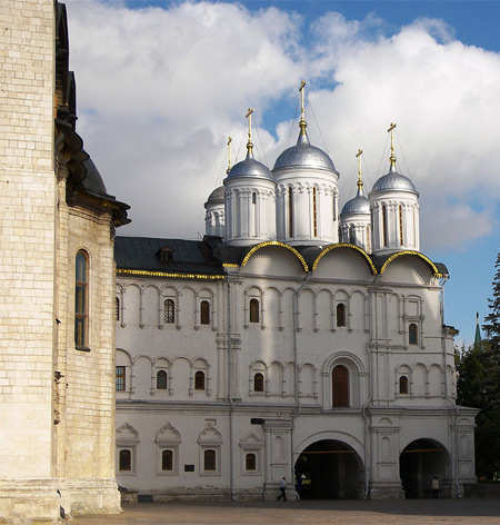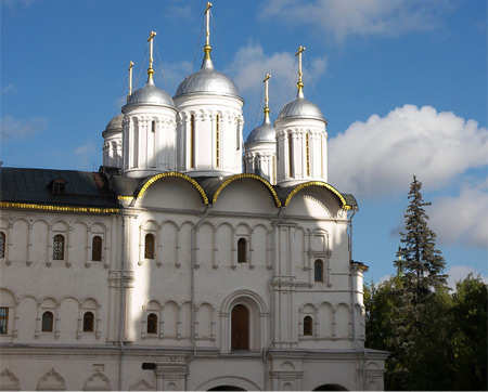 克里姆林宫内的教堂的教堂建筑也很有特色。宫内有一个教堂广场,广场四周围绕着四座教堂:十二使徒教堂、圣母升天教堂、天使报喜教堂及圣弥额尔教堂。但最美的教堂要数位于红场上的有“用石头描绘的童话”之称的圣瓦西里大教堂。它是伊凡四世时所建,由九座参差不齐的高塔组成,中间最高的方形塔高达17 米。虽然这九座塔彼此的式样色彩均不相同,但却十分和谐。更难得的是,它与克里姆林宫的大小宫殿、教堂搭配出一种特别的情调,为整个克里姆林宫增色不少。据说此教堂落成时,伊凡四世在惊叹之余,为防止设计者设计出更好、更完美的建筑,竟下令挖掉他的眼睛。