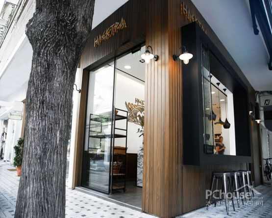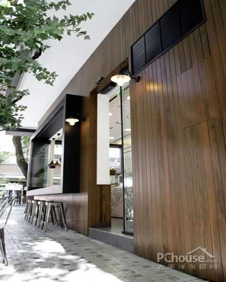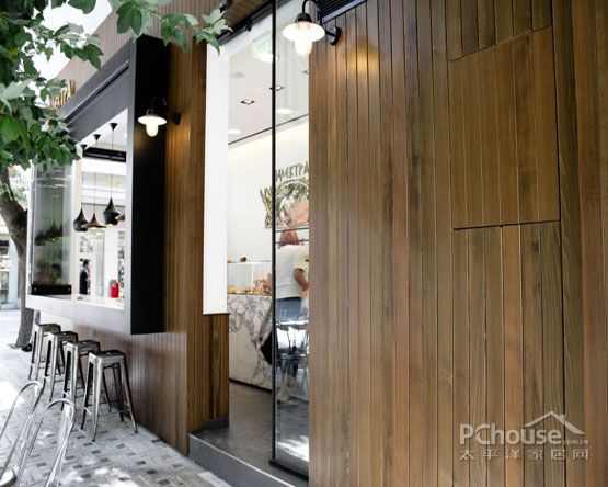 垂直的雪松板让室内空间充满了技艺风味。正面采用的雪松板材质和黑色粉末涂层钢窗,更进一步突出店铺的独特外观。外扩空间用于室内和室外的座位区和酒吧设计。