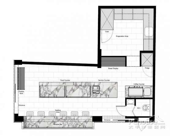 从狭窄的线型平面图上看,该店以一个大理石食物柜台为基础,是空间布局的重点所在。