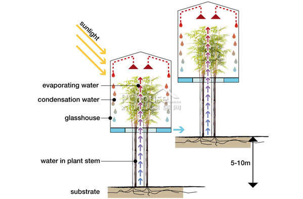 阿卡迪亚树塔,一座经典的未来式建筑,灵感来自于非洲沙漠,特别是阿卡迪亚的树木。Pospisil先生强调,就像真正的树木一样,阿卡迪亚树塔将会依据当地民众的需要,或高或低地建造成型。