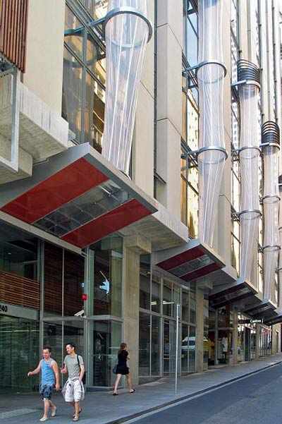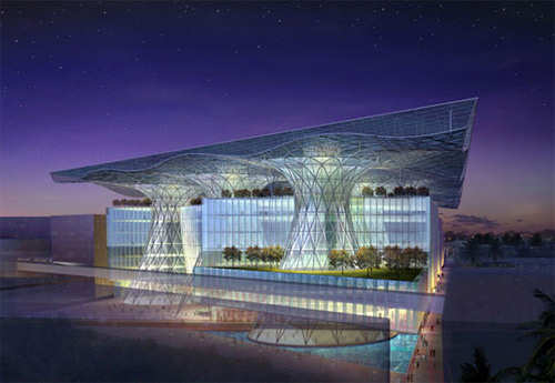 迪拜垂直村(Dubai Vertical Village) 鉴于迪拜所处的沙漠地貌特征 ,其建筑如何可以在利用太阳能发电的同时,还可以避免内部温度过高是建筑设计师一直在思索的问题。其中一个解决方案是,建筑的设计可以使得其自身可以为建筑提供阴凉。Graft设计的垂直村就是这一设计思维的绝佳体现。垂直村略带倾斜角度的低级,使得其建筑主体可以处于太阳能板遮盖之下,而对角板型的大厦也可以降低低角度太阳光的渗入。大厦可设置为住宅单元,而建筑基座可设置为电影院、宾馆、及购物场所等。