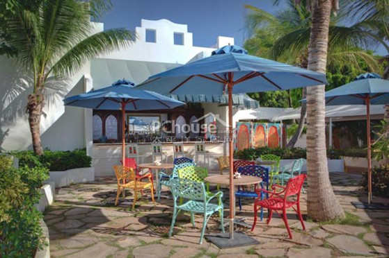 舒适大方的木椅、藤椅和木桌,散布在白色的沙滩上,以及室内,你可以闲适地坐望海天一色的美景。