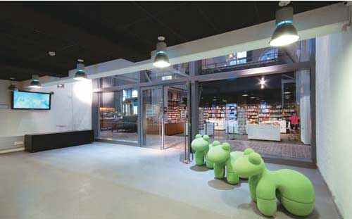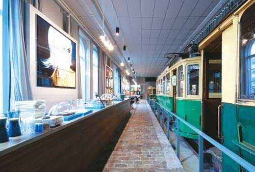 当你顺着“侯车大厅”进入站台,就会看到不同历史时期的电车被放置在长方行的两端,几节车厢静静的陈列,如同马上就要开始出发的架势。这样的陈设也将该空间分隔成三部分——靠近入口的咖啡吧、中间的多功能区(包括书店、可移动礼堂和舞台)以及最靠里的展览区。这样的空间格局很有意思,正好迎合的设计者的初衷:让原本沉闷的空间回归工业感的同时,其他的功能变得更加清晰。于是,对于工业感的打造,电车是一个重要的元素,同时,设计者还希望电车依然能够发挥它的空间传输功能。想一想100多年前的人们,坐着电车,去礼堂看电影,去美术馆看展览,去咖啡厅见朋友,那时的匆匆行程在这里被定了格。历史依然是历史,但是现在,你可以在电车的两旁,悠然享受这种旅程的快乐。这种时间与文化上的重叠给了所有到访者一种时空交错的概念,自然会让人觉的不需此行。同时,为了让这种独特的历史工业气息依旧留存,电车两侧粗砺的砖石走道被设计师保留了下来,它延伸到各个局部的空间,如同一个站台,不同的是你进入的不再是一个个车厢,而是不同风情的休闲场所。