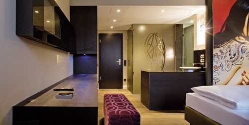 酒店设有117间客房,灯光让充满暗色漩涡的房间呈现出柔和的色调。套房配备的淋浴设施,高雅而简洁,彰显着品质生活。透过大落地窗,可以俯瞰城区,黑白主色调搭配柔和的灯光,大幅壁画让空间增添了一份灵气。吧台的设计人性化,独自喝上一杯,然后温暖入眠,多么惬意。门口的抽象图形,也出现在了磨砂的玻璃门上,起到装饰作用。酒红色的座椅上有花朵造型的图案,与窗帘上的图形、灰紫色的墙面相映成趣。室内没有饱和度很高的颜色,都是温暖妥帖的,试图营造家的感觉。