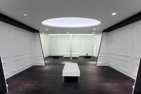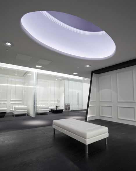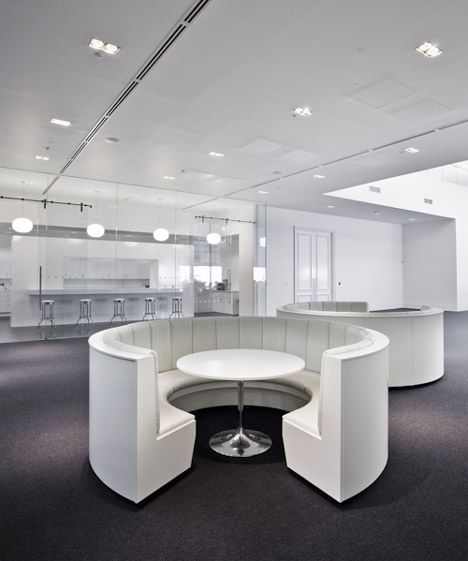 我们的解决方案是建立一个“工作仙境”,利用总部位置“不标准”的特性(没有使用标准的办公室元素),同时包含了先进的工作环境,建立了一个三维空间体现Net-A-Porter品牌。 为了达到这个目的,我们使用平滑的拱形结构的天花板,订制具有现代艺术的灯光设备、典雅的水晶玻璃吊灯、高耸的超大镶板门、雕刻的家具,及具有浅色、单色调色板并符合尺寸的亚光和高光泽处理混合物……连同一份仔细挑选、精心收藏、符合预算的家具、非常简约且符合规格的地毯和涂料饰面。