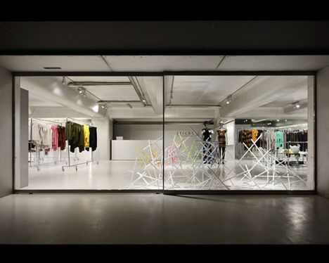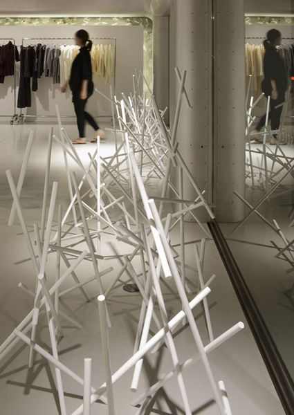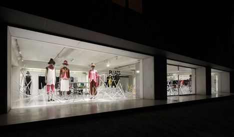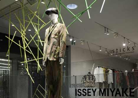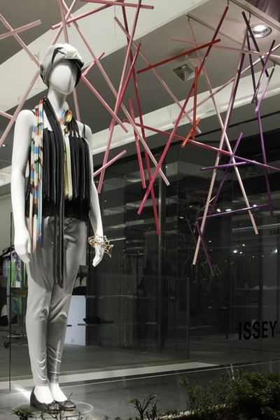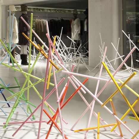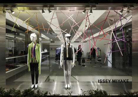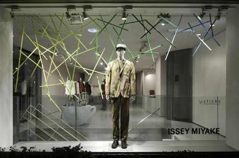 东京设计师Emmanuelle Moureaux为东京三宅一生时装连锁店设计了一系列由彩色棒交叉组合成的设置。