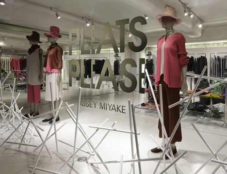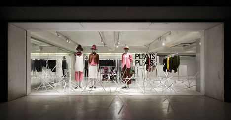 三宅一生时装店有女装、男装、PLEATS PLEASE ISSEY MIYAKE三个区域,由411支棍子把这三个区域连接起来。