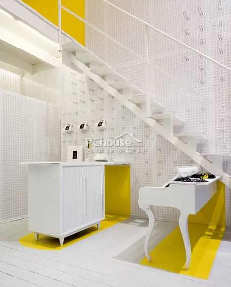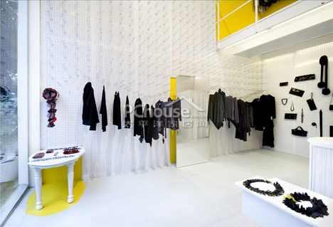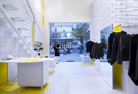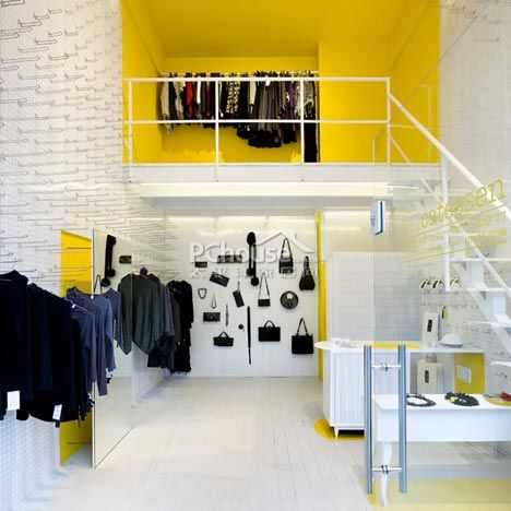 店内的家具设备看起来好像从墙壁里冒出来的一样,因为某些家具的部位被刷成了黄色而产生了特殊的视觉效果。其中一面墙上陈列着各色服装,而正对门口那面墙则挂着各种款式的手袋。