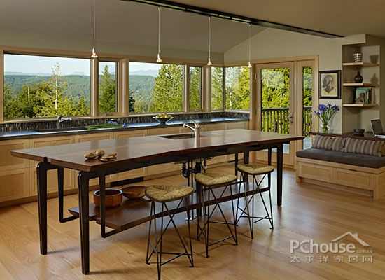 翻新后的室内有一种近似于国家森林里的烽火瞭望塔的感觉。再加上开敞的感觉,设计师还定制了一个岛屿餐桌,它的材质是可回收的榆木厚木板和黑色钢铁底座,水槽部分嵌入石灰岩。