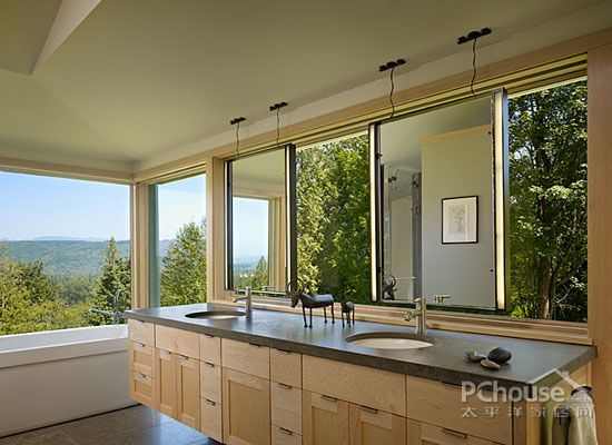 翻新项目的第二部分集中在主浴室。与厨房的设计相似,浴室也装置了一面玻璃墙,这样就能轻易观赏到河谷的美妙风景了。
