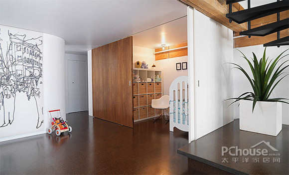 低层采用一系列滑动的隔离物,它们可以将白天的单一开阔空间的布局转换成晚上使用的两个卧室和一个育婴室。