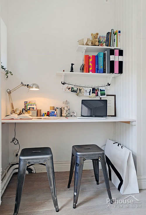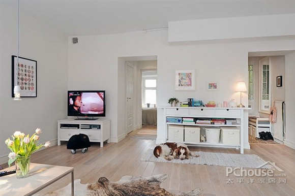 这间公寓最大的特色是用一个白色的栅栏作为隔断,隔开了客厅和厨房两个空间,而栅栏亦给人独特的视觉效果。