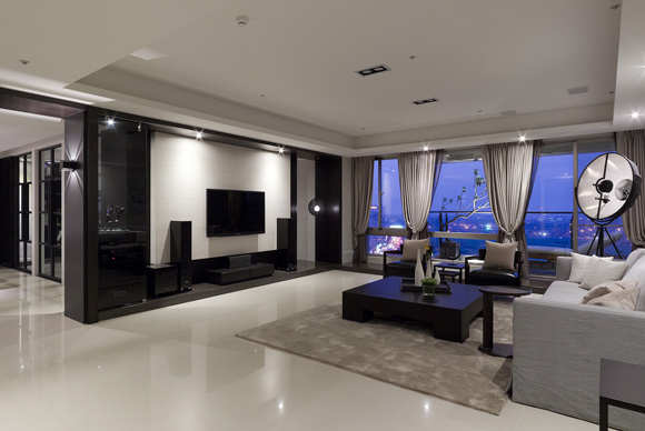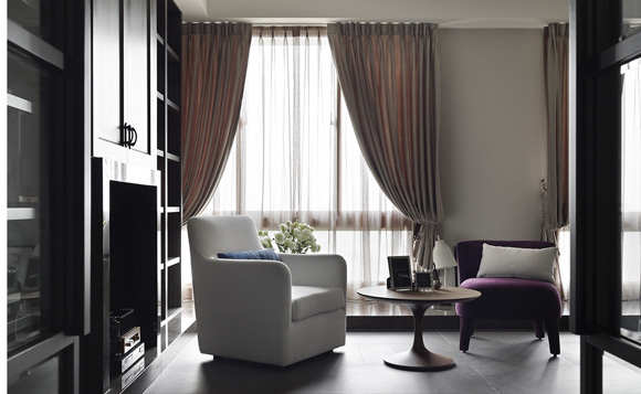 在石材的硬质基底,张馨巧妙以傢俱带出柔软度,混搭性的装饰古典线条从落地窗帘到沙发,层层突显空间品味,透过造型灯具的选用,不仅取代主灯光源设定,也让空间更富味道。