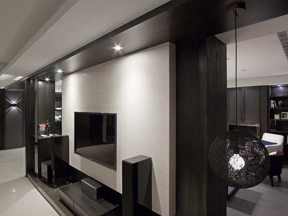 走进玄关内抛光石英砖的拆除,地坪到立面有了一制性的大理石语汇,同材质的唿应引领着造访者步入客厅动线,因为了解使用者而贴近的设计,张馨将原设计图中黑白强烈对比的电视主墙,从黑白根大理石改换成层次低调的木化石堆砌,并以削光手法处理降低石材反光度,而玄关延伸而出的大理石则在低矮机柜起始,向客厅落地窗面及书房延伸,以T字型走法凝聚出客厅重心。