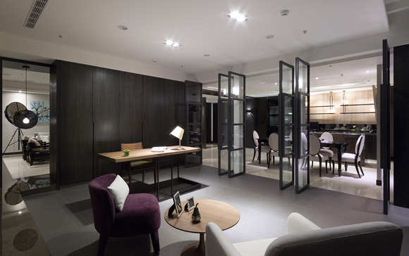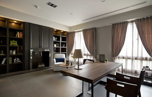 考量到未来使用性张馨再将格局微调,将叁房中的一房放大做为书房之用,阳光优雅洒落,深色基底带以浅色软件为主轴,天然木皮染色以黑中带绿的低色度,构筑出开放式书架造型,佐以奢华却又线条极简的壁炉,创造出美式现代感的书房空间,也让屋主音响收藏有了适当安排,除了书桌设定外,小桌几的置入女主人可在一旁上网、轻松阅读。