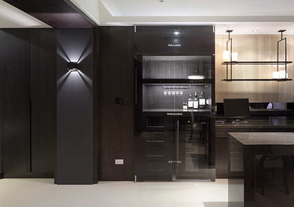 横向的层次,张馨以粗犷木皮提味,轻食吧柜到餐桌,视野落上阵列式六片玻璃隔子门,敞闭之间皆能导以明亮採光,烹调规划上分以轻食与热炒区块,量身订做的铁件吊灯调和着空间滋味,精致的规划中,张馨在餐桌旁做入一道稳定墙,短墙面的设定挡住了厕所存在,视觉交错同时虚化了冰箱滞碍。