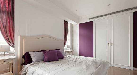 主卧以紫色粉刷搭配花纹壁纸,让素净的睡眠空间鲜活不少,床头左右称称的双开窗选用百叶,营造欧美渡假的休闲感。