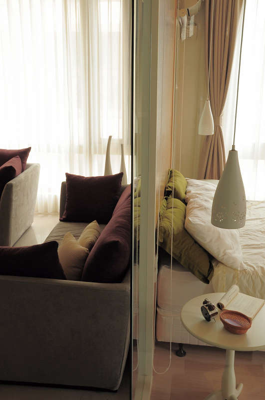 主卧室天花板采编织木板L型延伸至床背,高级渡假饭店的配备规格,真的让人有休闲渡假的美丽错觉,一旁摆上咖啡桌搭配吊灯,简单置物取代床头柜的功能轻巧又实用;卧室落地窗同样承袭客厅淡藕紫色的窗帘,卧室与客厅场域色调呼应外。也营造出浪漫优雅的睡眠氛围。