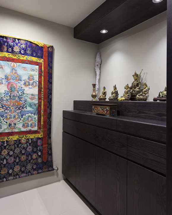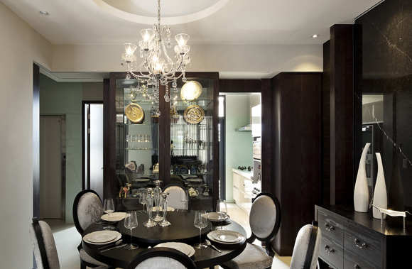 沙发背墙以暖灰色粉刷面呈现素净的无暇感,不着痕迹为室内强烈的黑与白作了中间色的揉合,更显得电视主墙的沈稳大器。餐厅圆桌和圆型天花板相互辉映,精致细腻的水晶灯柔化了凛冽的黑,用餐氛围变得高贵典雅。一旁玻璃柜以灰镜衬底,展示屋主珍藏的水晶杯及银器等,张馨设计师总是细心依照屋主的生活习惯及喜好,在空间中增加适当元素,让居家整体表露出屋主特有的个性及品味。