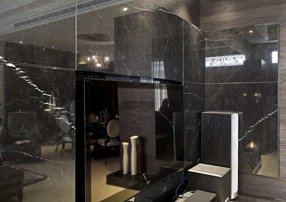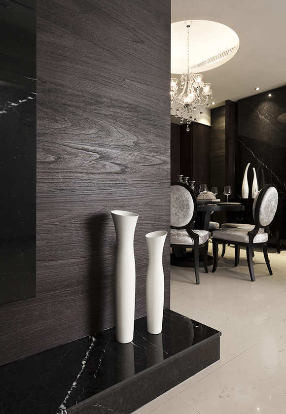 屋主一家人都喜欢黑色,顺理成章的就以『黑色』作为空间的要角,不过为了不让黑色有太过沈重的感觉,张馨设计师在空间中运用了许多小技巧,让黑色像施展魔法般在空间顿时增添了层次感,又将「白」和「灰」完美融入其中,仔细探究发现诀窍就在于选用不同的质材,包括木皮、石材、镜面和油漆粉刷等,各种材质优雅展现自身特有质地,交融在一起时又创造出令人惊艳的整体性完美演出。