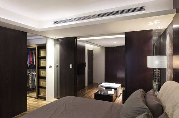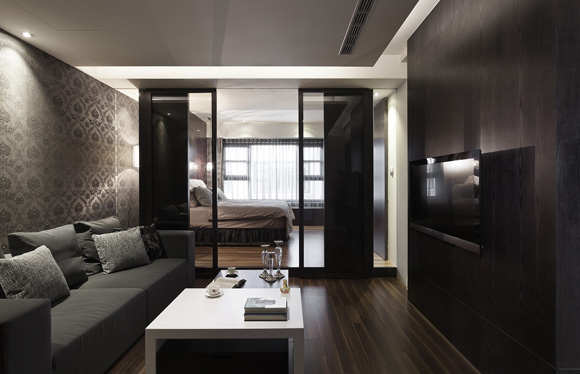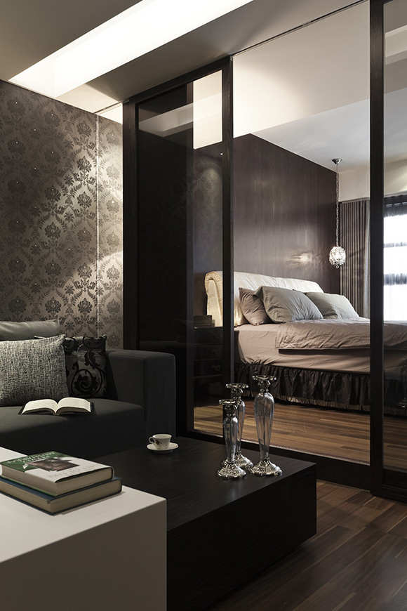 主卧室拉门以自然木皮染黑方式处理呈现些微咖啡色调,配上灰玻与整体空间一气呵成,成功将起居室与架高的睡眠区作场域区隔。起居室换上花纹壁纸从沙发背墙一路延伸至床边立面,在立灯的照映下营造华丽感,地坪温润木质共筑静谧意境。更衣室独立隐藏于另一面拉门中,天花板间接处理同时巧妙隐藏吊隐式冷气主机,中间仍维持挑高更显空间敞阔。欢唱KTV同时也是男主人泡茶区,因此在一旁设置流理台,承袭公共空间的黑白现代风格,运用立灯、LED投射灯等气氛光源,形塑放松愉悦的休闲氛围。