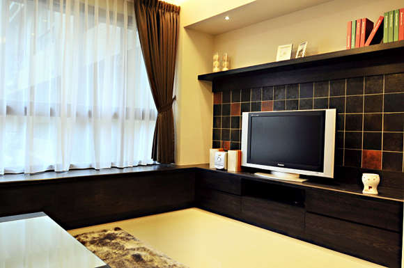 电视主墙是意大利砖,黑灰的质感内含红色的跳色点缀,是客厅场域中的视觉焦点,天花板运用间接照明展现自然灯沟,挂上一盏兼具节能省电和休憩感的吊扇,再次勾勒出休闲语汇,配上大地色系深咖啡搭白纱的窗帘,雾乡色的壁纸温润的色调充满整个客厅场域。