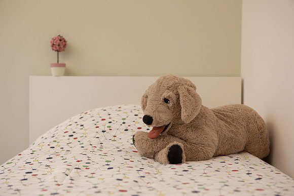主卧室同样承袭简约风,窗帘用的是银灰色系,和一旁吊灯的质感相呼厅,营造出浪漫静谧的休憩氛围。床边一景展现淡雅气质,灰色配上银色的饰品呈现精致的质感。男孩房调性自然简单,用莱姆绿活泼的色彩搭配小男孩开朗的个性。女孩房素雅温馨兼具收纳功能,实用又美观。