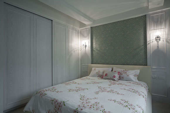延续着古典浪漫,花瓣床组铺陈出柔美的主卧空间,简约壁板线条加上壁灯,投射上暗金色壁纸,独有的蓝绿色彩点出屋主品味,考量到屋主收纳需求,设计师张馨以L型延伸出柜体,强化衣柜空间,也成了一处绝美卧榻。