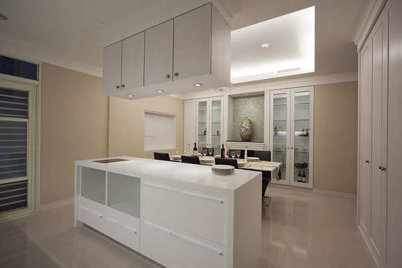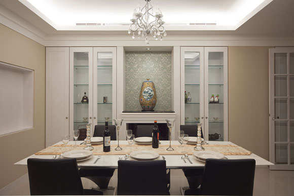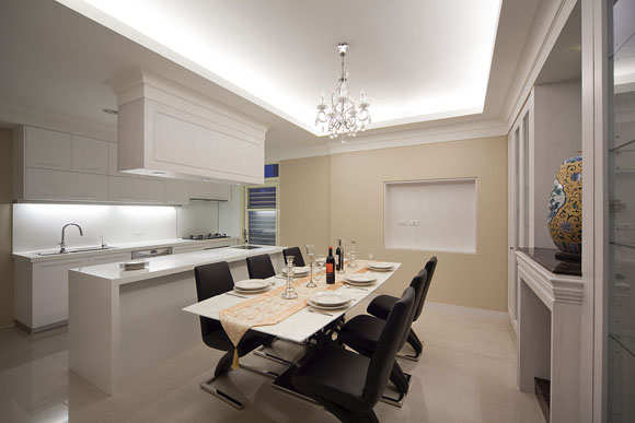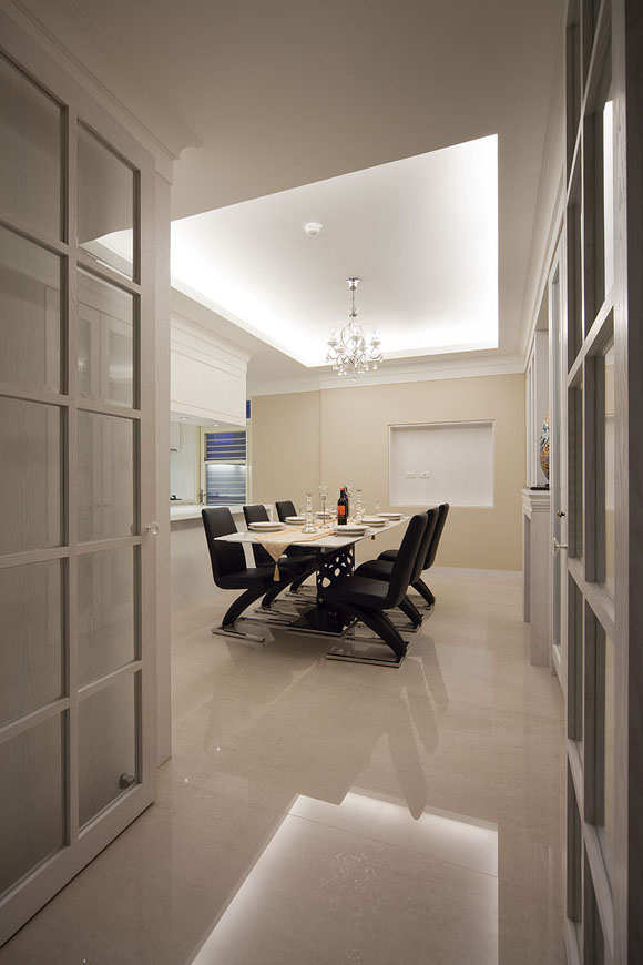 推开玻璃与木框搭构的白色对开门,满眼净白的空间以黑色的餐椅妆点黑白意象,设计师在现代表情的厨具与餐桌间以线板及导弧角规划上吊柜,兼具收纳机能之外,也简单区分餐厅与厨房的空间分野。从中岛望向餐厅的视线落在端景墙的艺术展示台面,壁炉的线条概念是维多利亚的符号特征。因屋主有大量采购的习惯,物品的收纳就很重要,加上一直有提到屋主希望客人与私人动线可以区分,所以大量的收纳都放在这边,由以门边的收纳柜两旁分别为冰箱与双开门。为让平面修整,所以这个收纳柜就特别的深。另外来特别将门片设计成摺门,这样就可以收纳大型物件了。