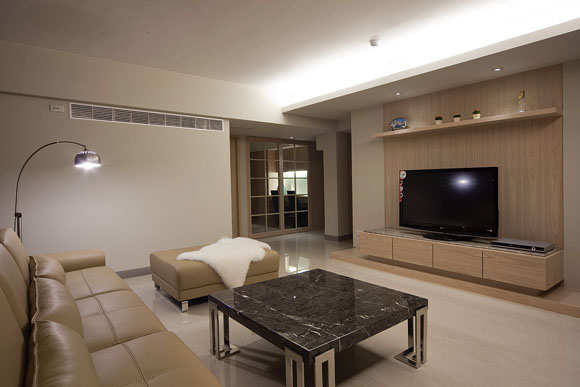 五口之家有大容量的收纳需求,从玄关延展进入客厅的柜体设计两面柜兼隔间墙使用。中间留空创造出走道的感觉,含有鞋柜收纳,一般收纳柜,还有电器用品的收纳功能,穿过拱门式的门斗是设计师为洗爱泡茶的屋主规划阅读休息室,双面柜在休息阅读室的这一端是收纳、展示柜,设计师巧妙运用天然木皮喷白营造的盈白古典,再加上门斗的虚化量体的功用,不见柜体的存在,只见简单的线板线条营造整体感的维多利亚风。