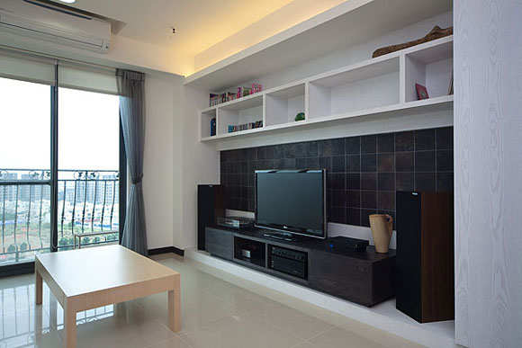 客厅区域藉由白、蓝、黑等颜色及家俬构组而成的界面,形塑空间的优雅氛围。藉由黑白为主的经典风格,透过实木的自然纹理取代烤漆的生硬表情,让空间充满人文的温度与情感的铺陈。以意大利砖立体的纹理作为主墙的背景,上方柜体系设计师考虑喜爱唱盘收藏的业主贴心特地就尺寸方面做规划的,搭配白色的基调规置出自然悠闲的生活调性。书房部份以白色作空间的基调,不仅有放大空间的效果,透过间接光源更显空间利落的层次感。