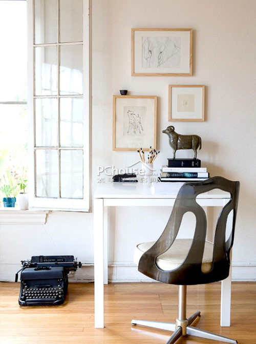 书房的设计充分体现了80后,对生活的追求,简单而个性。黑白线条的装饰画,配以原木框架,别有一番韵味。几本厚重的书籍随意摆放,并且发挥了其另一种作用——各种小的装饰垫。