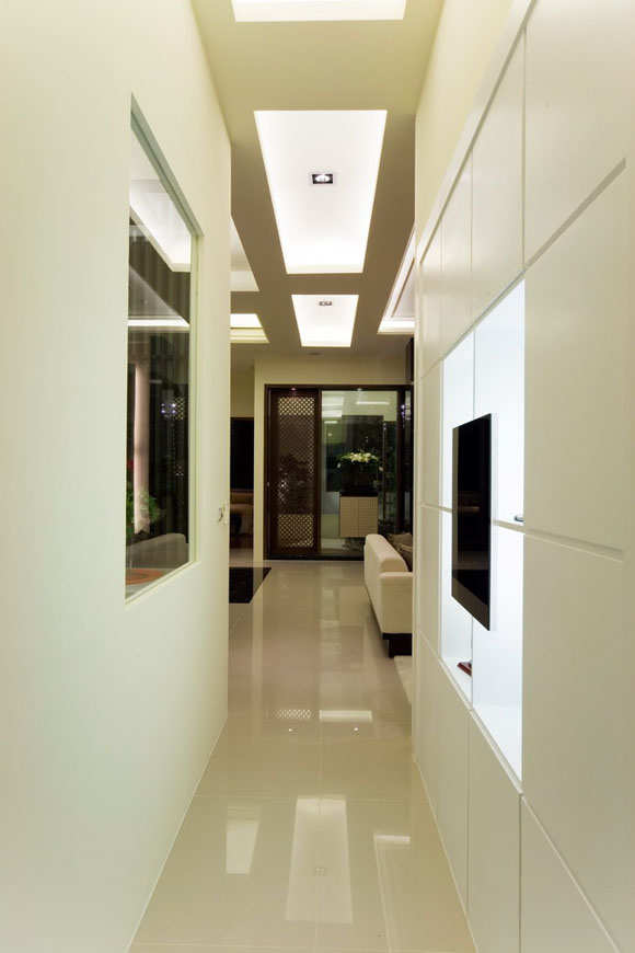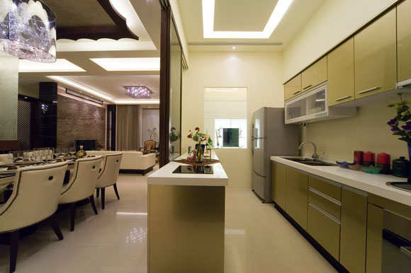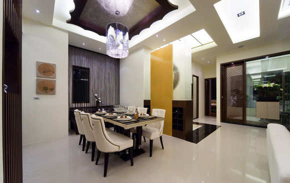 客餐厅三者呈现开放性的关连,天花板上利用间接光的变化,将属于彼此的空间界定清楚。厨餐厅空间赋予大地色调,餐桌椅采用古典线条,融合现代化的厨具,显现冲突华丽感。